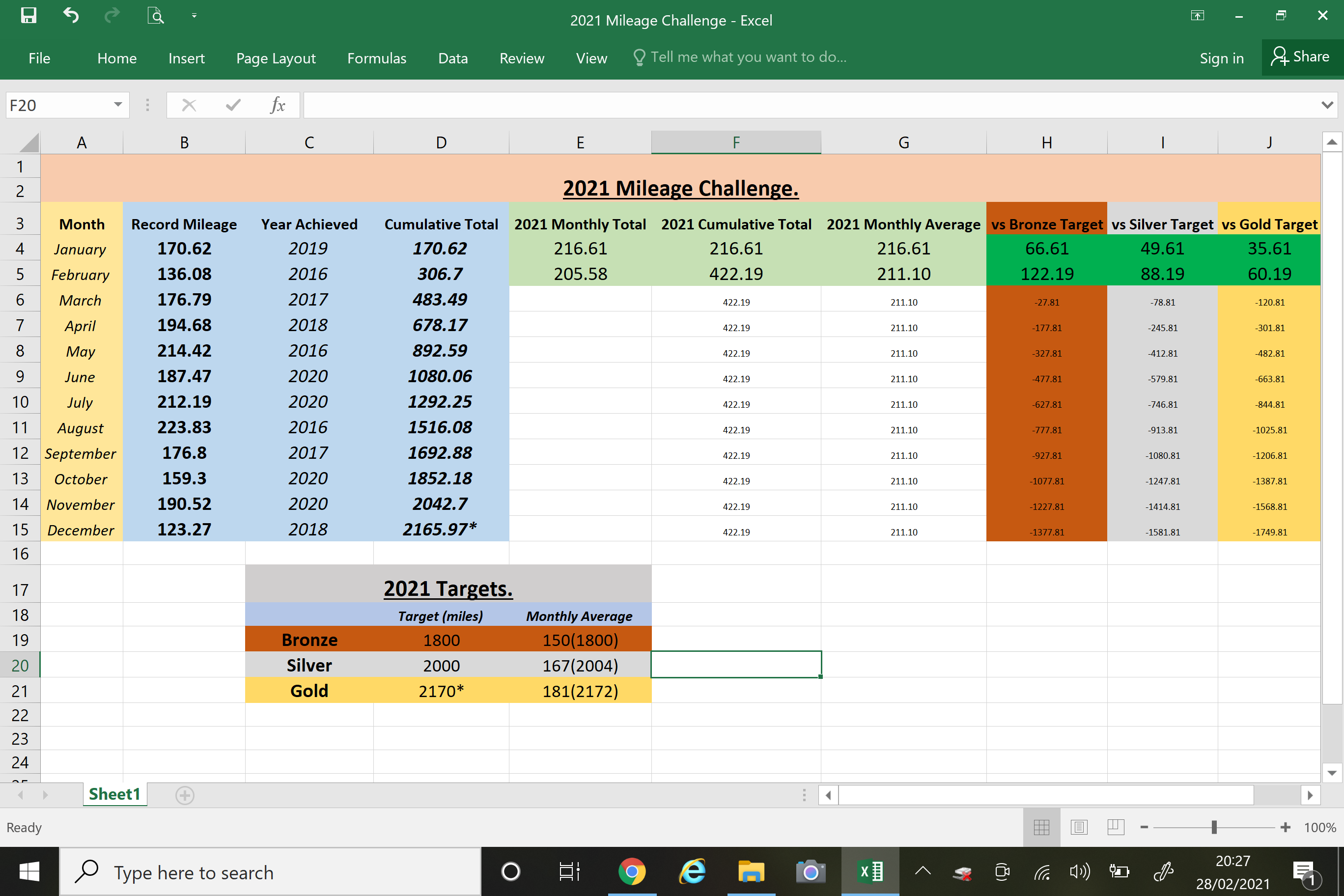 Bronze target (1800 miles) – as previously mentioned, my actual annual mileage record is 1755 in 2016. I would have beaten that easily last year had I not missed March entirely to injury, so my absolute base starting point for 2021 is 1800 miles. That’s a nice, round 150 miles a month and, injuries permitting, should be easily achievable given my new 5/6 day running week schedule.