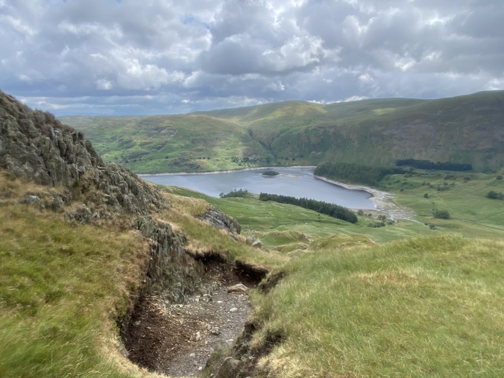 At the risk of repeating myself here, the boggy top was wet enough to keep feet soaked but not excessive, and I was able to run this soft surface part of the descent with no real issues created by my tender feet, until the rocky, bracken section right at the bottom, where I was passed in quick succession by four fellow 100ers: including Matt Neale and a lad called Jonathan who, along with Matt, I would be seeing a lot of between now and Blea Moss. We all hit the bottom together and, on an otherwise empty path, formed a 5-man ultra train that was together pretty much all the way to Mardale Head! This didn’t bother me initially as my sore feet meant I was definitely the slowest of the five but, as we got further towards Mardale Head, I certainly wouldn’t have minded passing the lad at the front as I could have gone a little bit quicker.