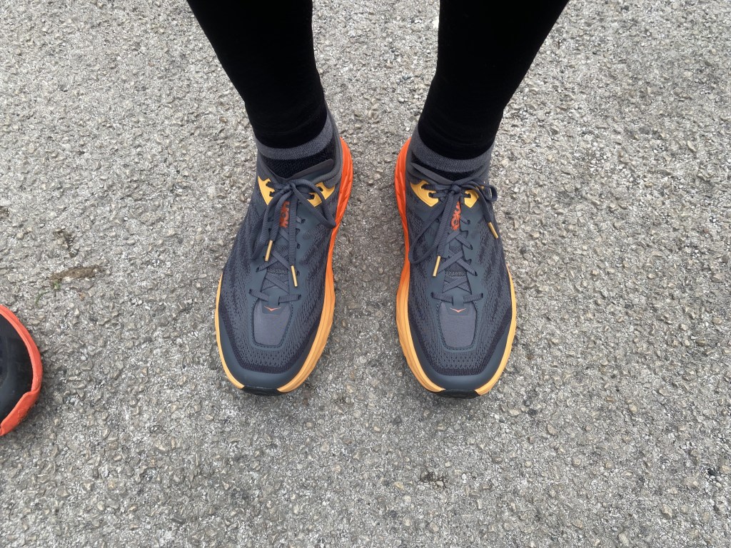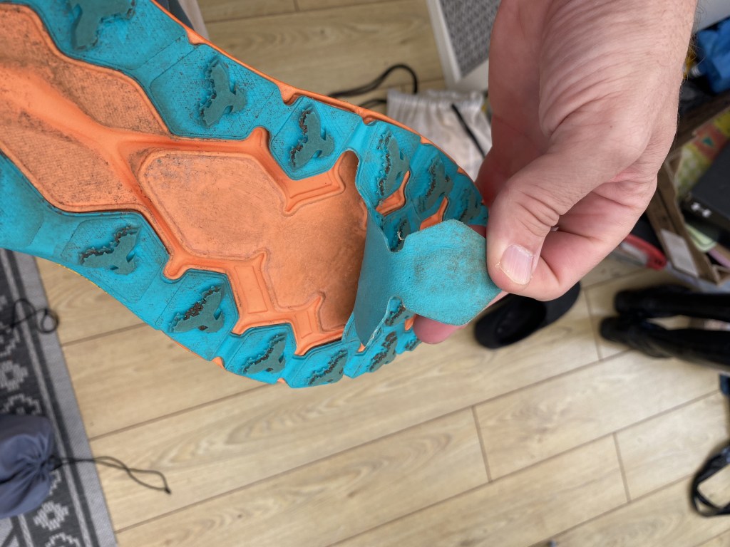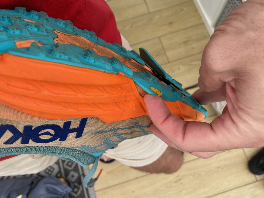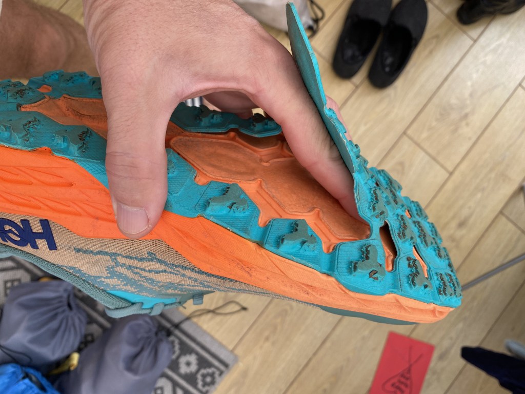Photos of my 15 mile old Hoka Speedgoat 5s; the sole hanging off as discovered at 4.25pm on race day! (95 minutes before the start!)