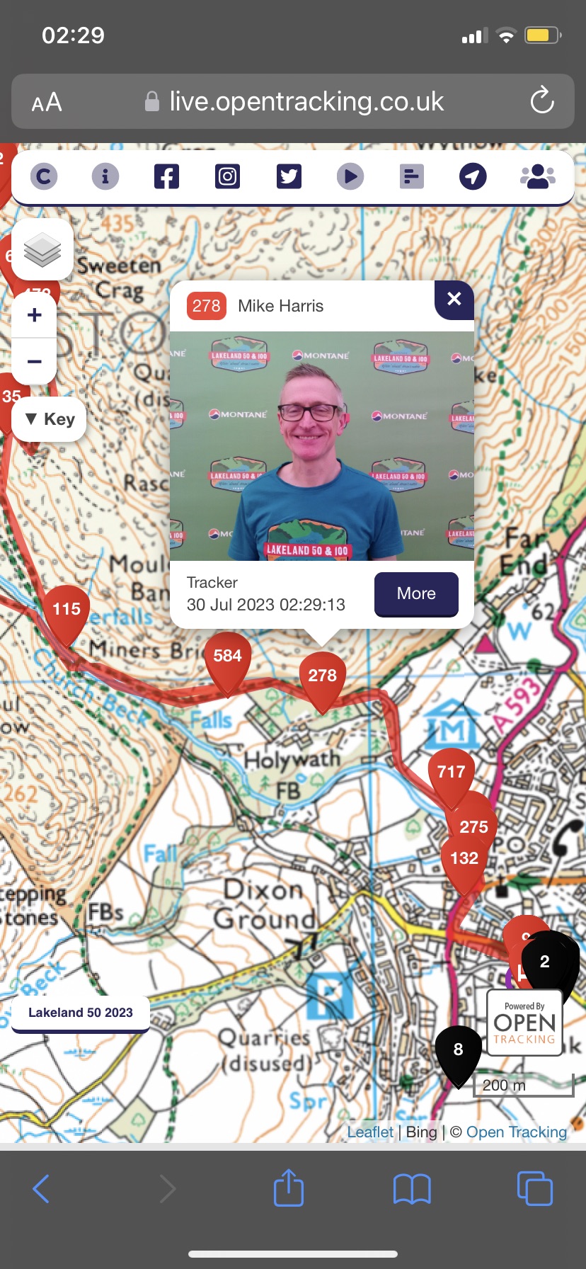 Just time for a quick look at the tracker before unconsciousness and there, like magic, descending it’s way into Coniston, was dot 278! Coach Harris was going to make it! That alone was enough to send me off to sleep happily. Quite a day or two – or three.