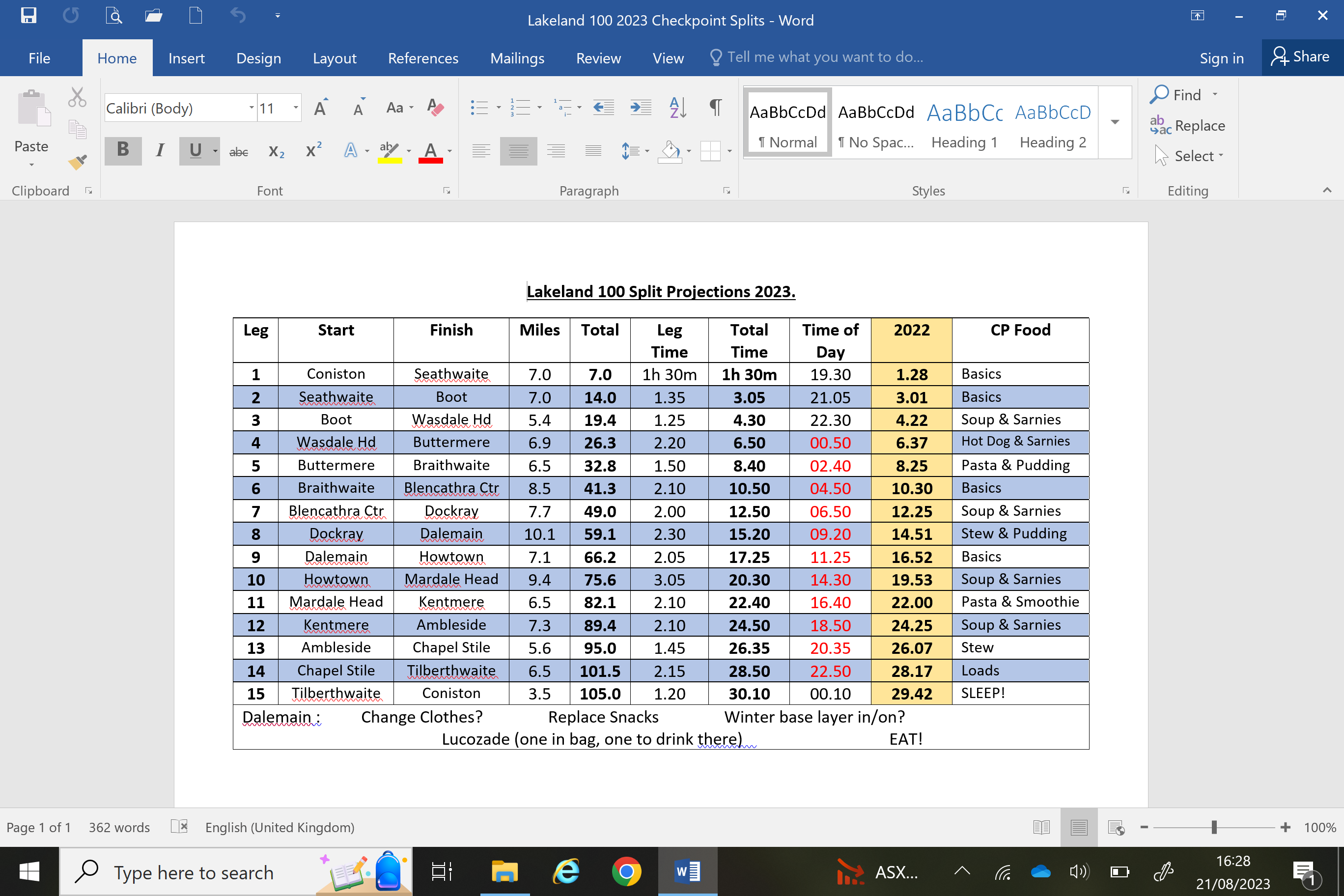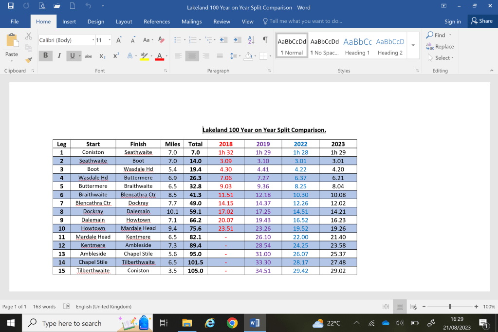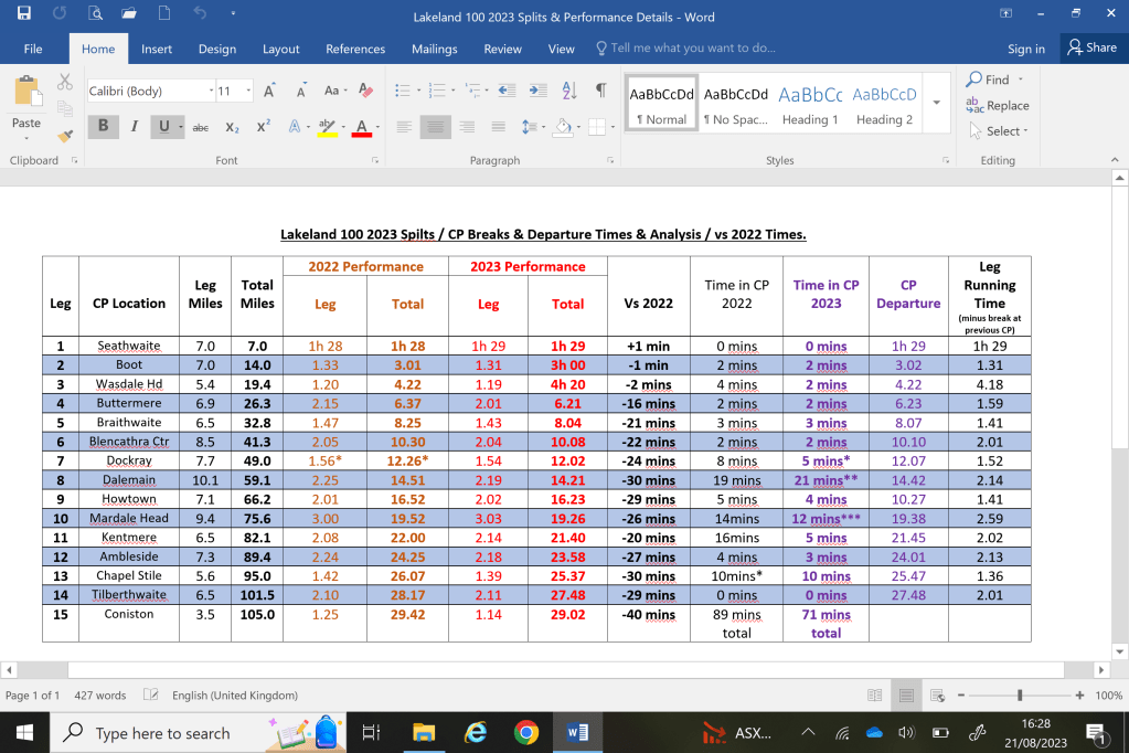 As you can see above, I reduced my CP time from 89 minutes in 2022 to 71 minutes this year. Aside from Dalemain, I’m not sure I could take any more time off, without then risking not re-fuelling properly, but it is always good to focus on, because 71 minutes is still a long time in a race! I could say more, but that is for another time (blog?!) so I’ll leave it there for now. But hopefully, someone reading might find the above information useful (I took the idea from the late John Kynaston) and maybe hit that sub-30 they have been aiming for.